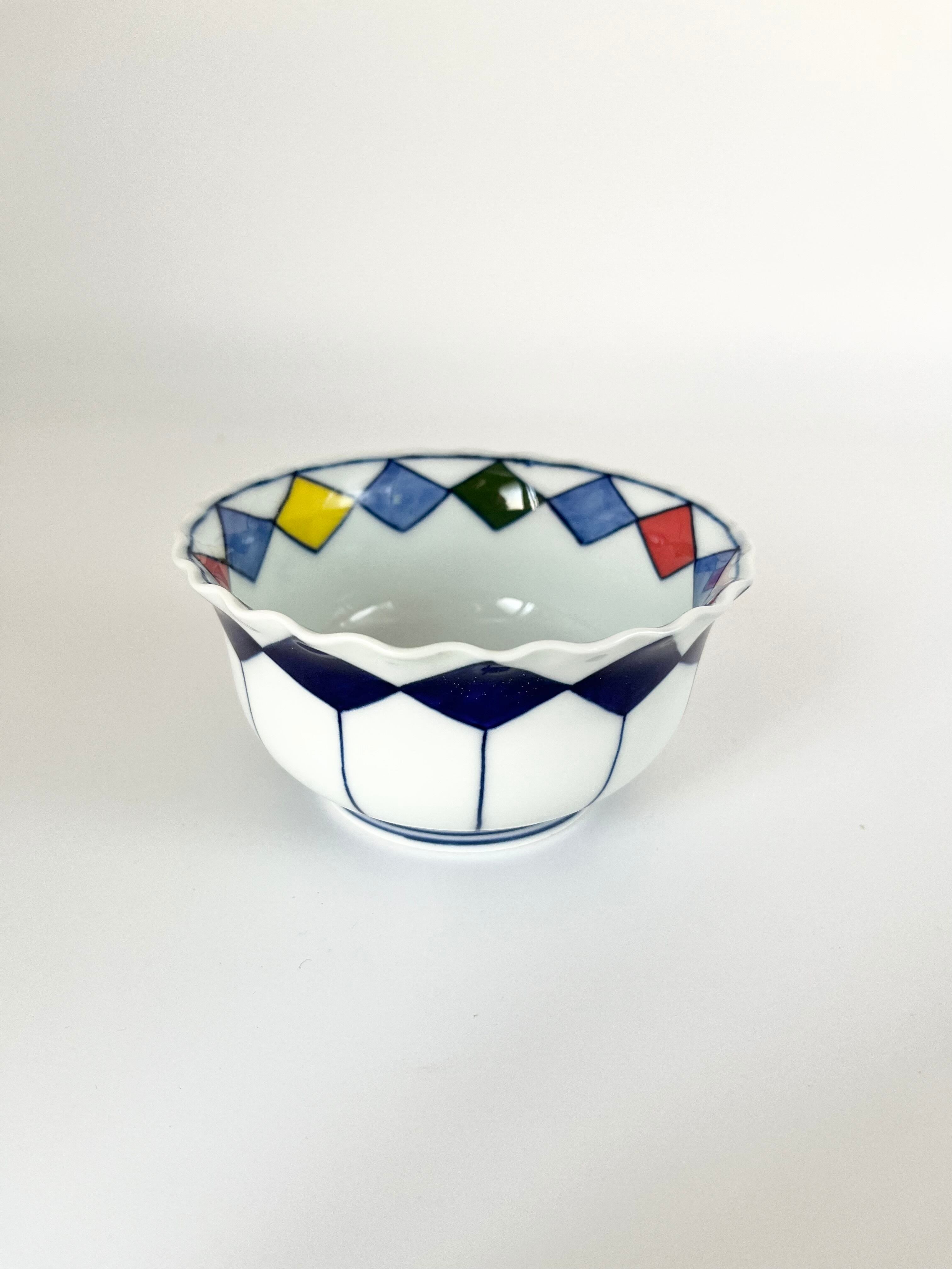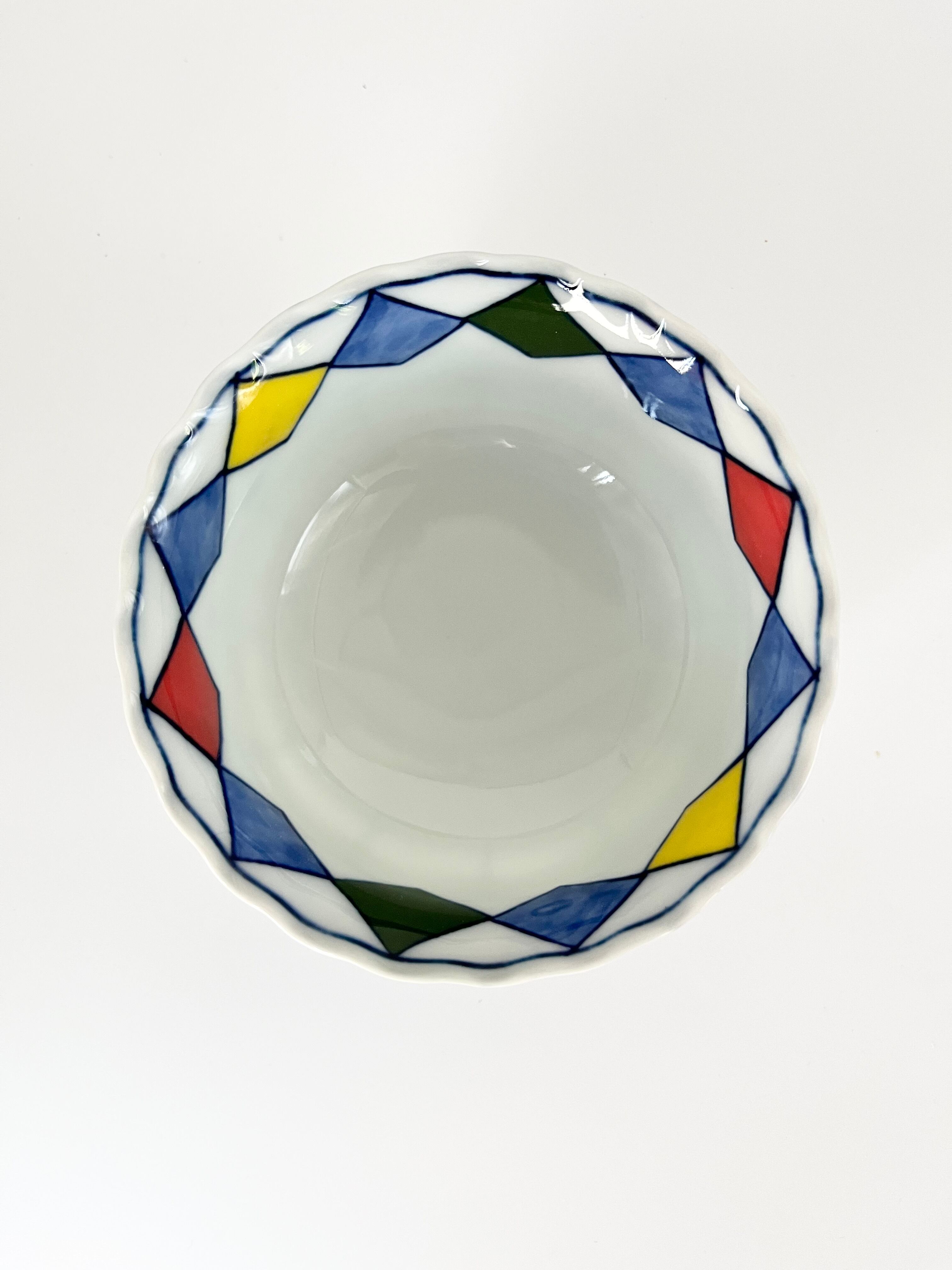 内側の渕に菱紋を描きカラフルな色合いに仕上げ、外側の渕にも菱紋を描き、濃いめの呉須で表現し器の形とマッチしたデザインの商品です。存在感抜群の中鉢、食卓が一層華やかに彩られますよ☆是非お手元で実感されてみてはいかがですか?