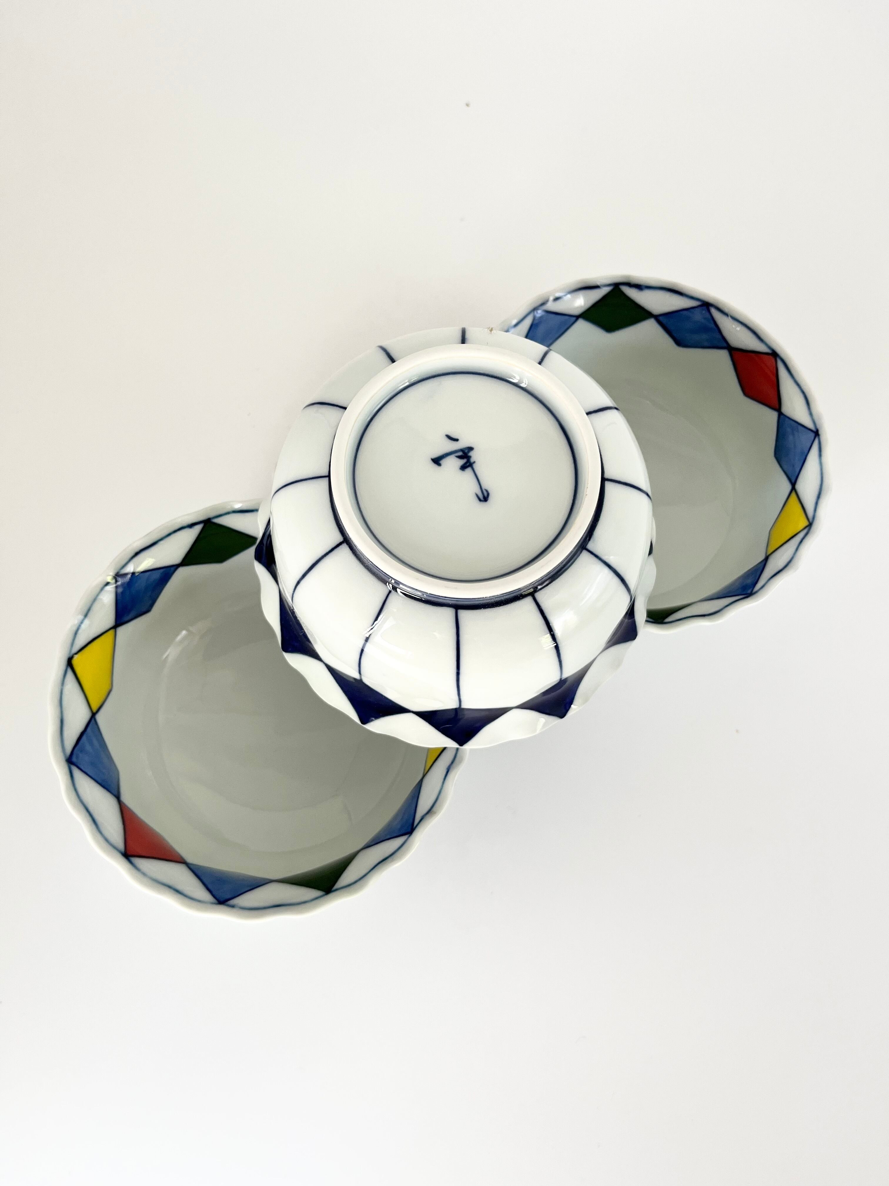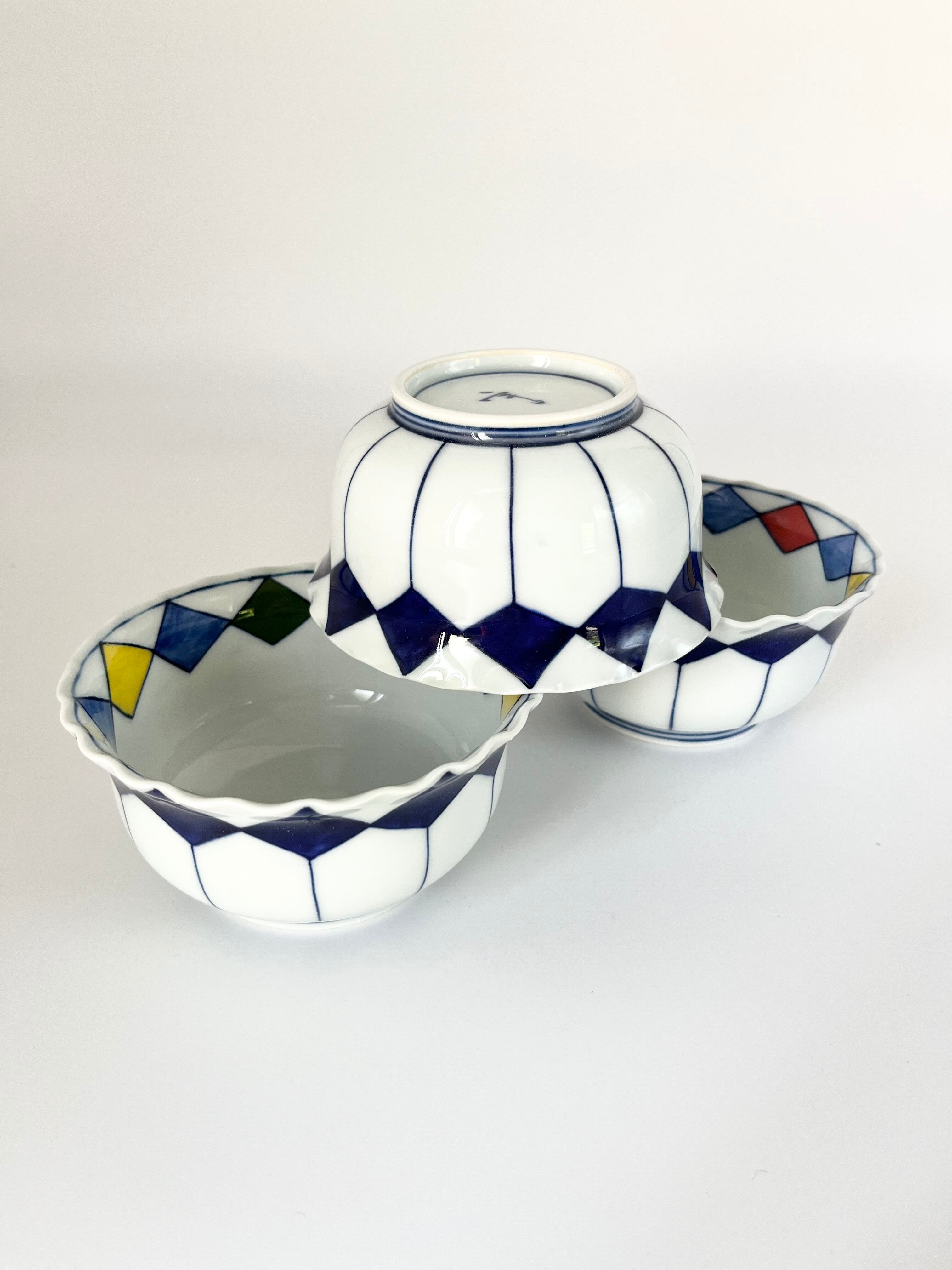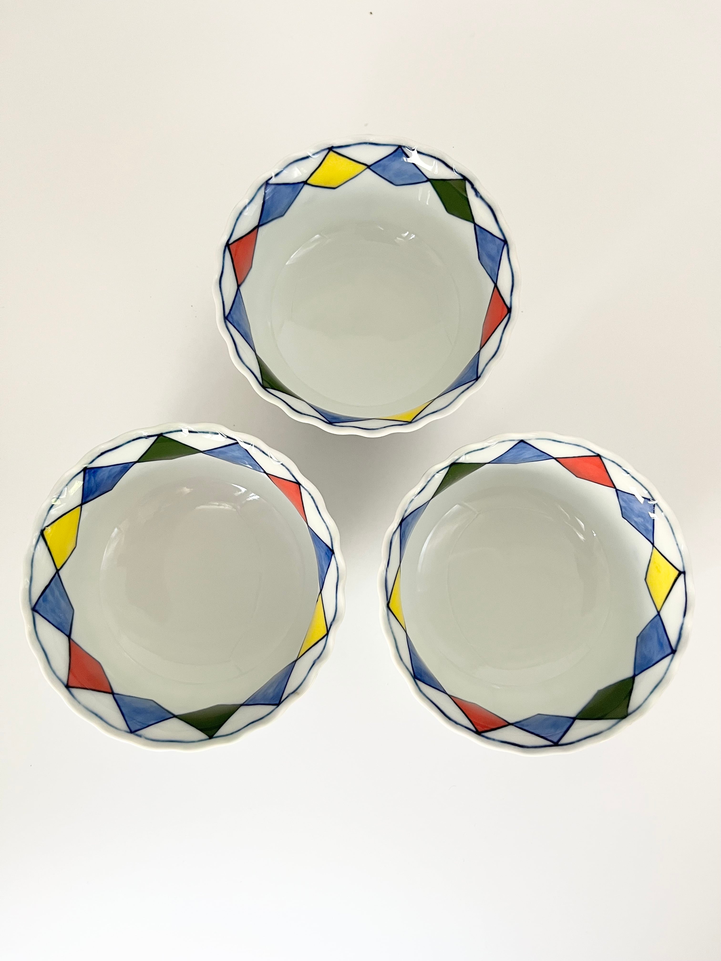 内側の渕に菱紋を描きカラフルな色合いに仕上げ、外側の渕にも菱紋を描き、濃いめの呉須で表現し器の形とマッチしたデザインの商品です。存在感抜群の中鉢、食卓が一層華やかに彩られますよ☆ 3個お揃いで是非お手元で実感されてみてはいかがですか?