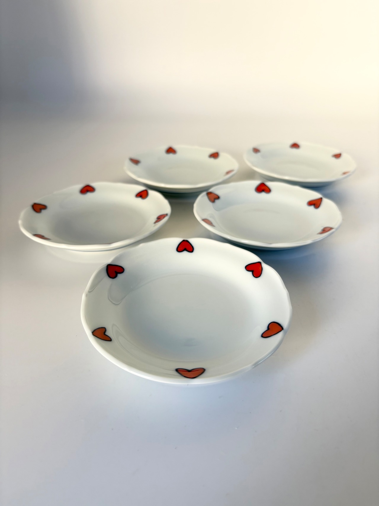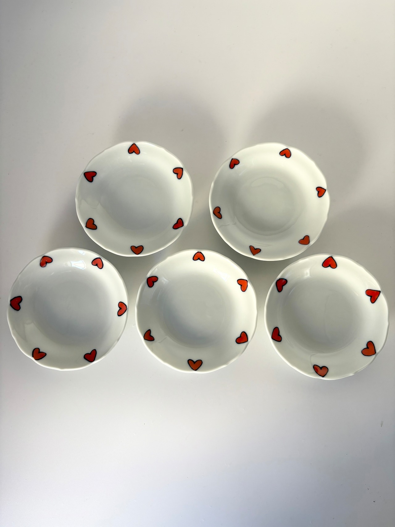 内側の渕に小さなハートを六方描き、紅一色を施し、外側には筋で引き締めて、シンプルながらとってもcute♡に描いた商品です。白いお皿がより際立つデザインで、見た目の可愛らしさからもlovelyな気持ちにさせてくれること間違いなしですよ。自然と笑顔になれるような明るい食卓が待っていますよ☆ 素敵な器とともに幸せなひとときを…♡ 是非お手元にてご実感下さい。