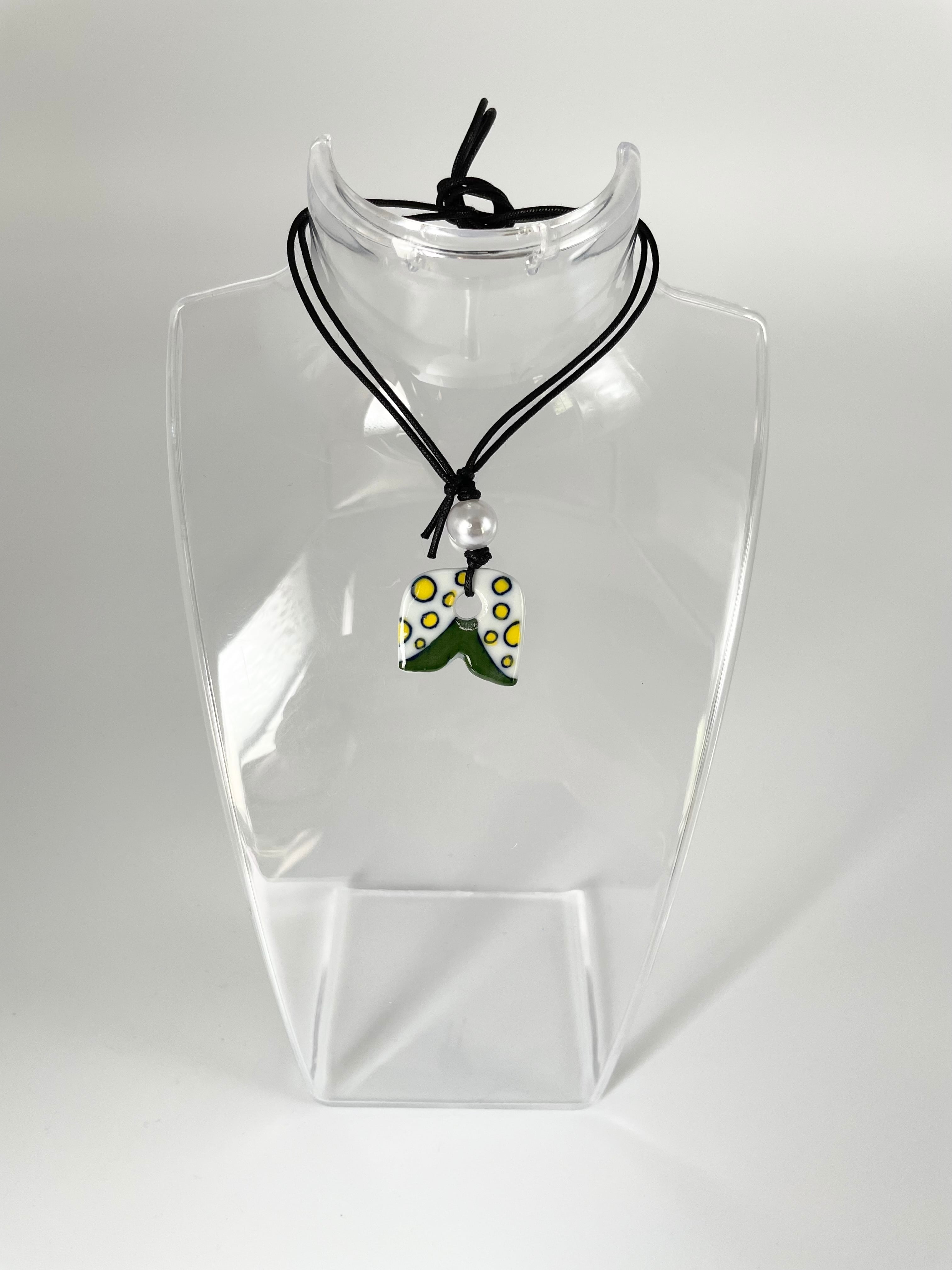 リボンの裾のような形に、黄色のドットをメインにグリーンと合わせたデザインのものと、ボーダーを意識して、藍と赤と点描きをバランスよく配置した手描きで可愛らしいデザインです!!リバーシブルなので、その日の気分に応じていつでも付け替え可能ですよ☆